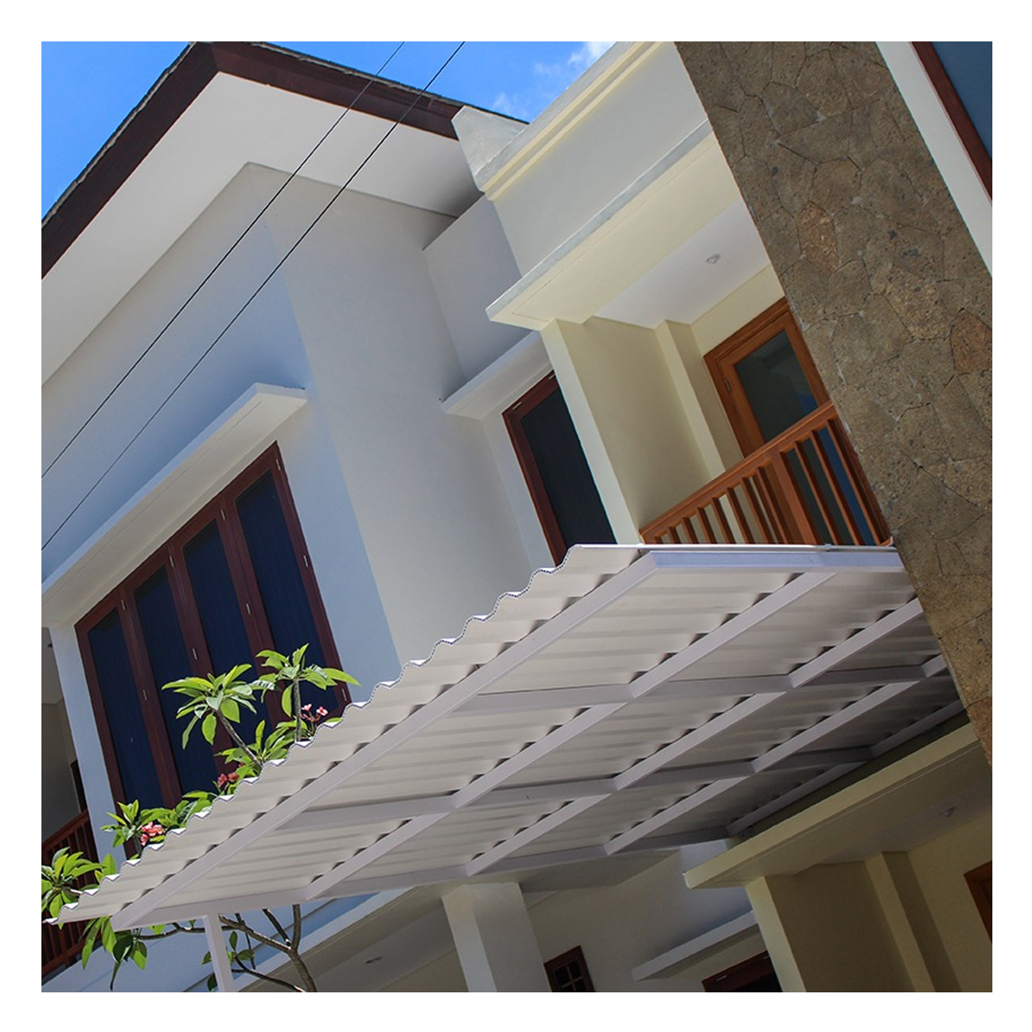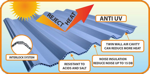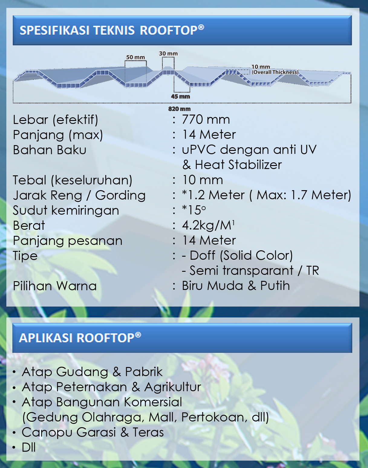 Rooftop adalah atap berbahan dasar UPVC yang sangat cocok diaplikasikan sebagai atap gudang dan pabrik, atap peternakan dan agrikultur, atap bangunan komersial seperti gedung olahraga, mall, pertokoan, dll. Juga dapat digunakan sebgai canopy garasi dan teras. Rooftop ini mempunyai kelebihan: sangat kuat karena memiliki ketebalan 10mm, tidak berisik saat hujan, tahan terhadap asam dan garam, mempunyai rongga twin wall, dan mempunyai lapisan anti UV yang dapat mengurangi panas dalam ruangan, hemat rangka dan gording, pemasangan sangat cepat dan mudah serta efisien. Tersedia dalam dua pilihan warna yaitu biru dan putih (doff )dan abu-abu (semi transparan).