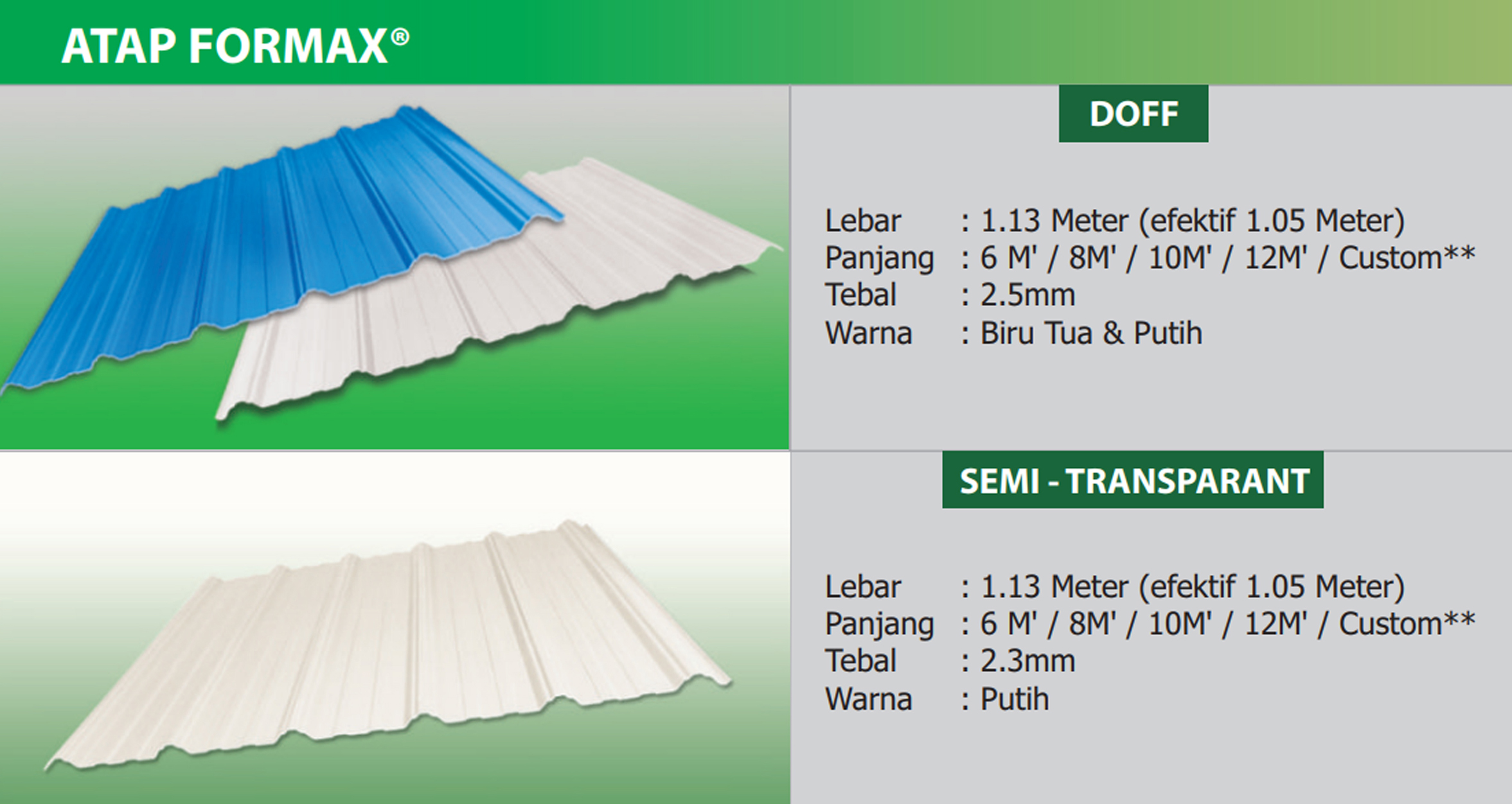 Formax roof adalah atap inovatif yang terbuat dari bahan UPVC dengan UV protection dan heat stabilizer yang di produksi menggunakan mesin berteknologi tinggi. Formax roof dapat diaplikasikan sebagai penutup dinding (wall cladding) dan lis plank, sangat cocok untuk menggantikan produk atap yang terbuat dari asbes, fiber, dan metal.
